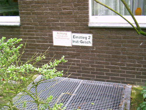 Auch der obige ist einer von mehreren neuen Eingängen in den ehemaligen, damals modernen "Atomschutzbunker" des (damaligen) Bundeswehrkrankenhauses in Osnabrück. Dieses Schutzgebäude wird heute von der Stadt und dem Klinikum Osnabrück als Archiv und Lagerräumlichkeit für soziale Organisationen genutzt. Die Bunkeranlage umfasst einen 1-geschossig errichteten Anlagenbereich, welcher sich unter dem gesamten darüber liegenden Gebäude ausdehnt. Die Anlage ist in Teilen noch funktionsfähig.